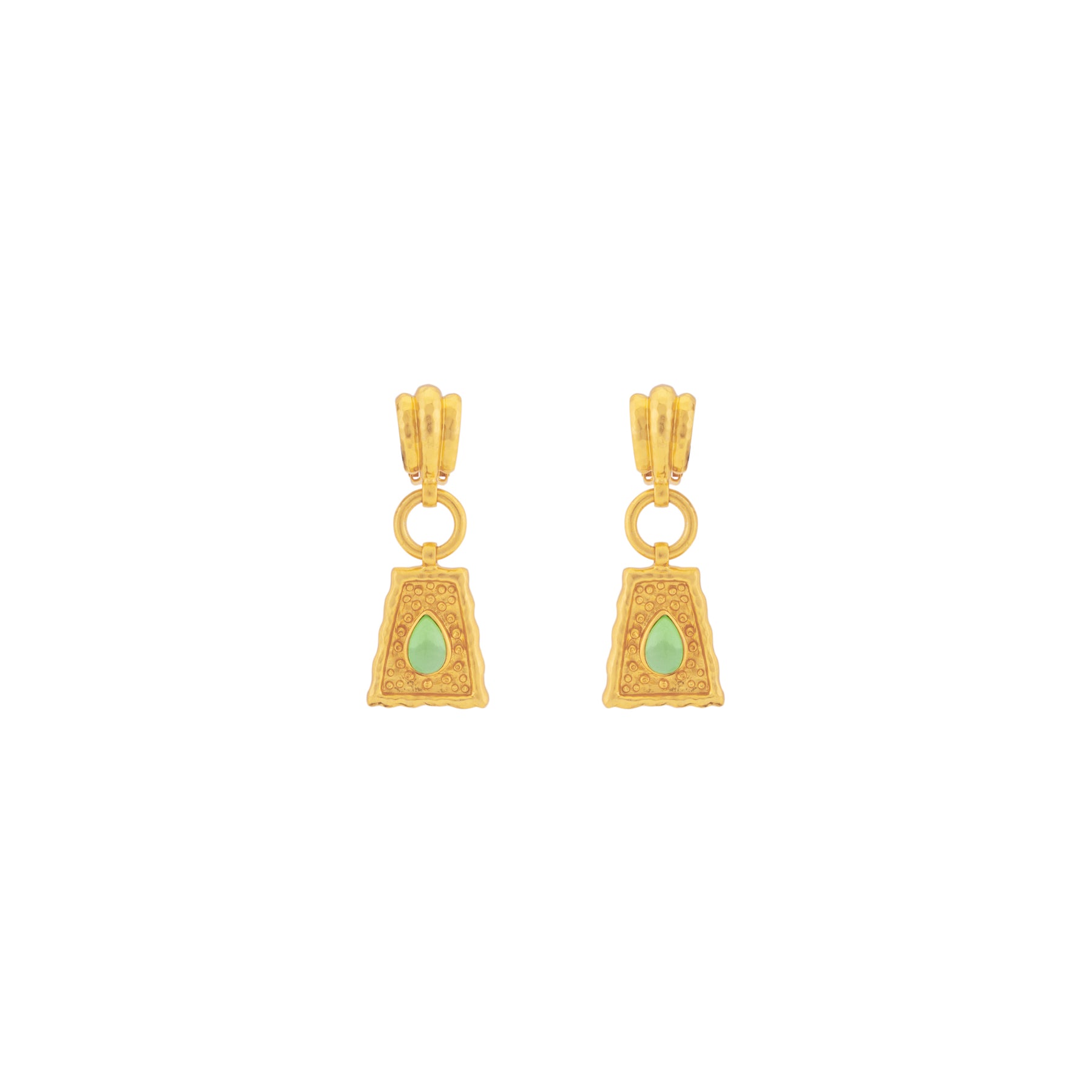Add a little touch of opulence to your look with VALÉRE's 'Mayan' earrings. Crafted from 24k gold plated brass with a unique design and embellished with a green peridot quartz stone. Style yours with a ruffled silk blouse