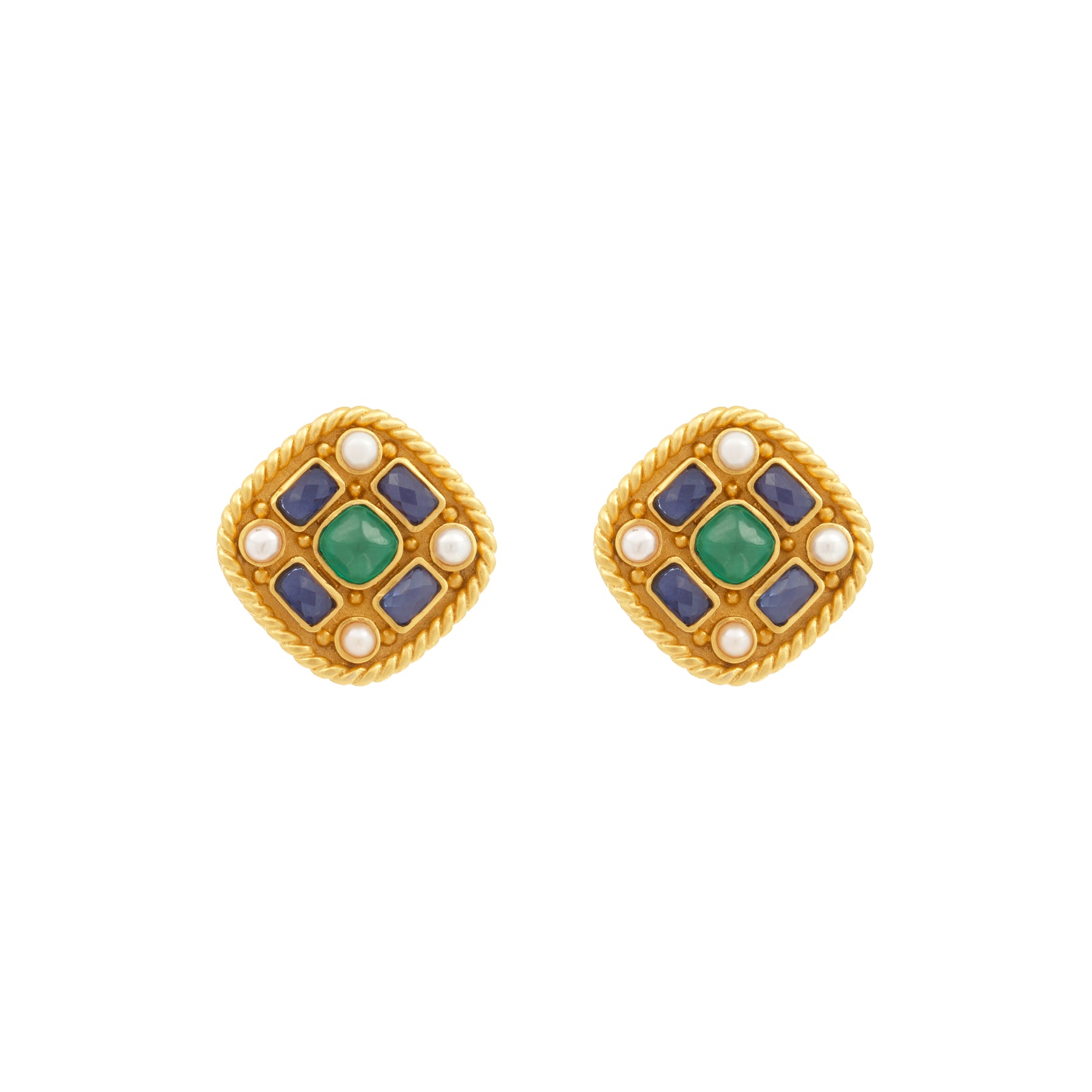 Add a little touch of opulence to your look with VALÉRE's 'Francesca' earrings. Crafted from 24k gold plated brass and embellished with emerald green quartz, blue sapphire & pearl stones. Style yours with a ruffled silk blouse.